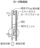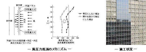 | ・ | 新たに設けられた外壁は、既存の外壁をそのままにして、その外側に約65p離して、 ミラーガラスのカーテンウォール取付け、外壁を二重(ダブルスキン)構造にしました。 また、カーテンウールは壁面上下端部が開口となっており、外気とダブルスキン内の圧力差を低減し、外装材の軽量化を図りました。 |