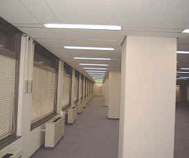 | ・ | 各階のペリメータの床置露出ファンコイルユニットを撤去し、電気式の天吊カセット型パッケージ゙式空調機に改修しました。電気式にシステムを変更したため、屋外キュービクルを増設し、電源を確保しています。また、屋上に室外機を設置するため、屋上に鉄骨架台を新たに架設しました。スケジュール運転・遠方発停・故障信号発信・課金等の制御を行なうため、監視盤を設置しました。 |